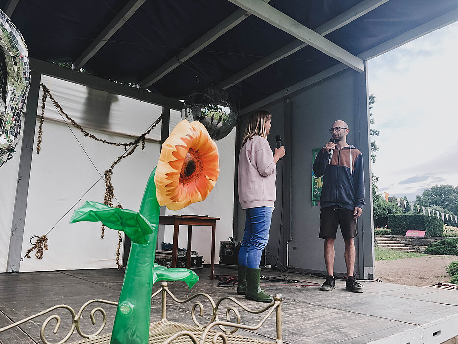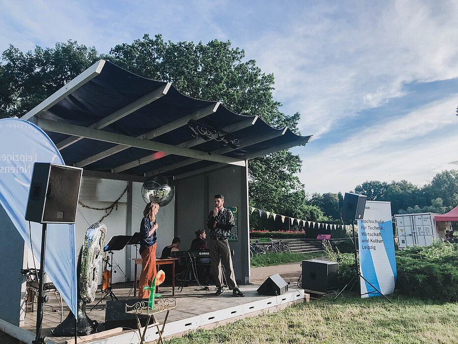 Nach fast zehn Monaten Arbeit war es am 8. Juli endlich soweit - Studierende der Medientechnik konnten bei einem jüdischen Themenabend beim Hörspielsommer 2021 ihre Hörspielreihe "Heimweh" vor Publikum zur Uraufführung bringen. Die Hörspiele sind in Kooperation mit der Leipziger Notenspur und unter Rücksprachen mit der jüdischen Gemeinde in Leipzig entstanden. Unterstützung bekamen die Studierenden auch von Hörspielproduzentin Pauline Kingsbury. Knapp 100 Besucherinnen und Besucher lauschten an diesem sonnigen Abend den vier Hörspielen. Auch intensive Diskussionen wurden in einer moderierten Fragerunde im Anschluss geführt. Abgerundet wurde der Abend mit Gesprächsrunden mit Thomas Schinkel, Musikwissenschaftler, und Svitlana Kapitanova und Musik vom Trio Rozhinkes. Projektleiterin seitens der HTWK war Susann Hommel, die sehr stolz auf die Leistung der Studierenden ist: "In sehr kurzer Zeit haben sie über das Medium Hörspiel einen tollen Zugang zu einem sehr anspruchsvollen Thema gefunden und dazu beigetragen Geschichte und Gegenwart jüdischen Lebens auf kreative Art und Weise sichtbar zu machen. Da kann ich nur den Hut ziehen."